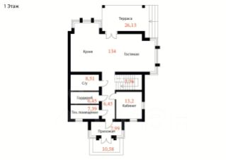 1 этаж - большая кухня-гостиная с выходом на террасу, спальня или кабинет, оборудованная гардеробная, санузел с большой душевой, котельная.