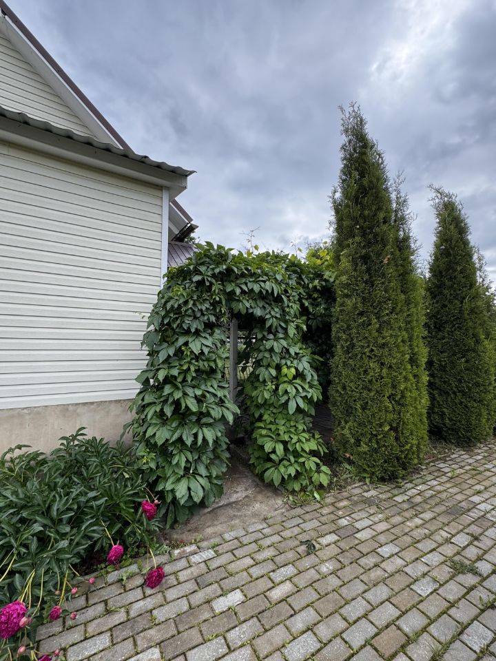 На участке ухоженный газон, смородина, крыжовник, кустарники, яблони. Также стоит теплица. площадка под три машины.