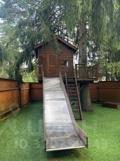 Ландшафтный дизайн находится на высшем уровне. Газон в идеальном состоянии, вся территория выложена дорожками. На участке также есть детская площадка с горкой и домиком на дереве.
