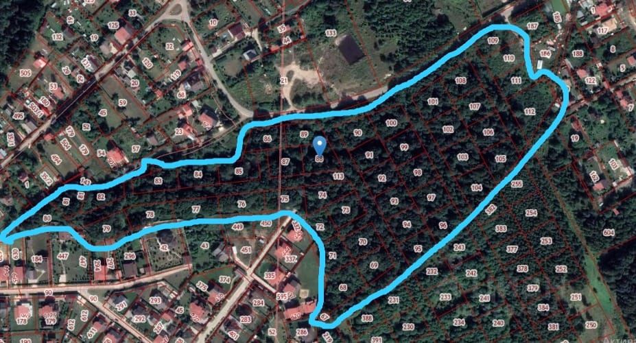 Массив из 49 участков, в настоящее время вся земля поделена участками по 14 соток с асфальтированной дорогой вдоль участков, на сегодняшний день собственником принято решение перемежевать по 6-9 соток, под одно домовладение.