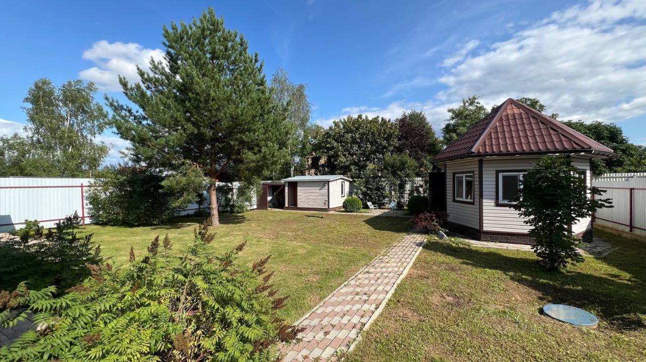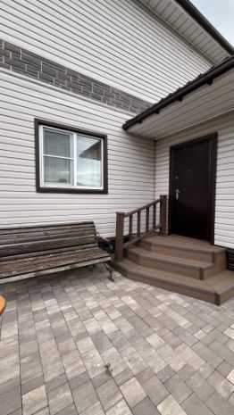 Все строения на участке выполнены в едином стиле (фасады закрыты сайдингом, крыши дома и бани - металлочерепицей, окна - пластиковые, вокруг всех строений отмостка тротуарной плиткой). Дорожки и зона отдыха также вымощены тротуарной плиткой.