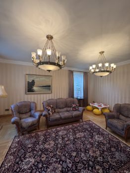 На первом этаже - теплые полы в холле и санузле, этаж состоит из кухни, санузла, котельной, гардеробной, кабинета, гостиной, холла (на полу керамическая плитка, дубовый паркет, на стенах венецианская покраска, обои);