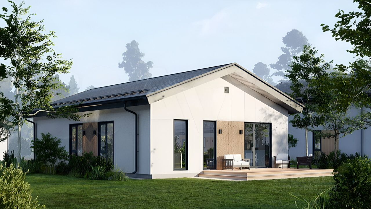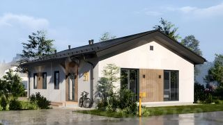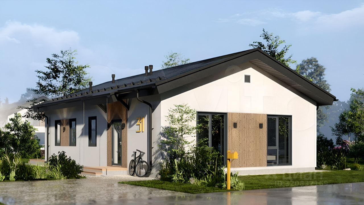 Фасад — комбинированный, фасадная штукатурка+планкен лиственница.