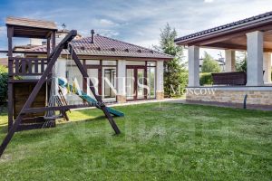 Участок ровный, с ландшафтными работами: газоны, дорожки, освещение, декоративные насаждения, система полива и автополива.