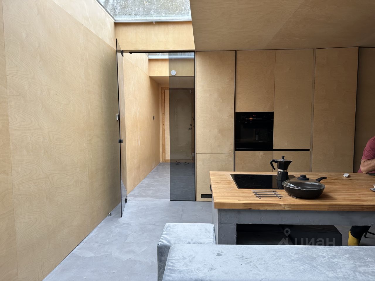 Каркасный деревянный дом от domplus.club 124 кВ.м из них 24м терраса. Фундамент свайный, внутри пол микроцемент, стены березовая фанера покрытая лаком, 1 санузел, 3 отдельных комнаты под спальни или кабинет, большая гостиная 30м2, совмещенная с кухней, панорамные окна, теплый пол, электричество, все необходимое для круглогодичного проживания, включая встроенную кухню, электрическую варочный панель, стиральную машину с сушилкой, интернет и Wi-Fi, отопление с возможностью установки теплового режима для каждой комнаты, антенну для усиления связи, дровяную печь и тв.