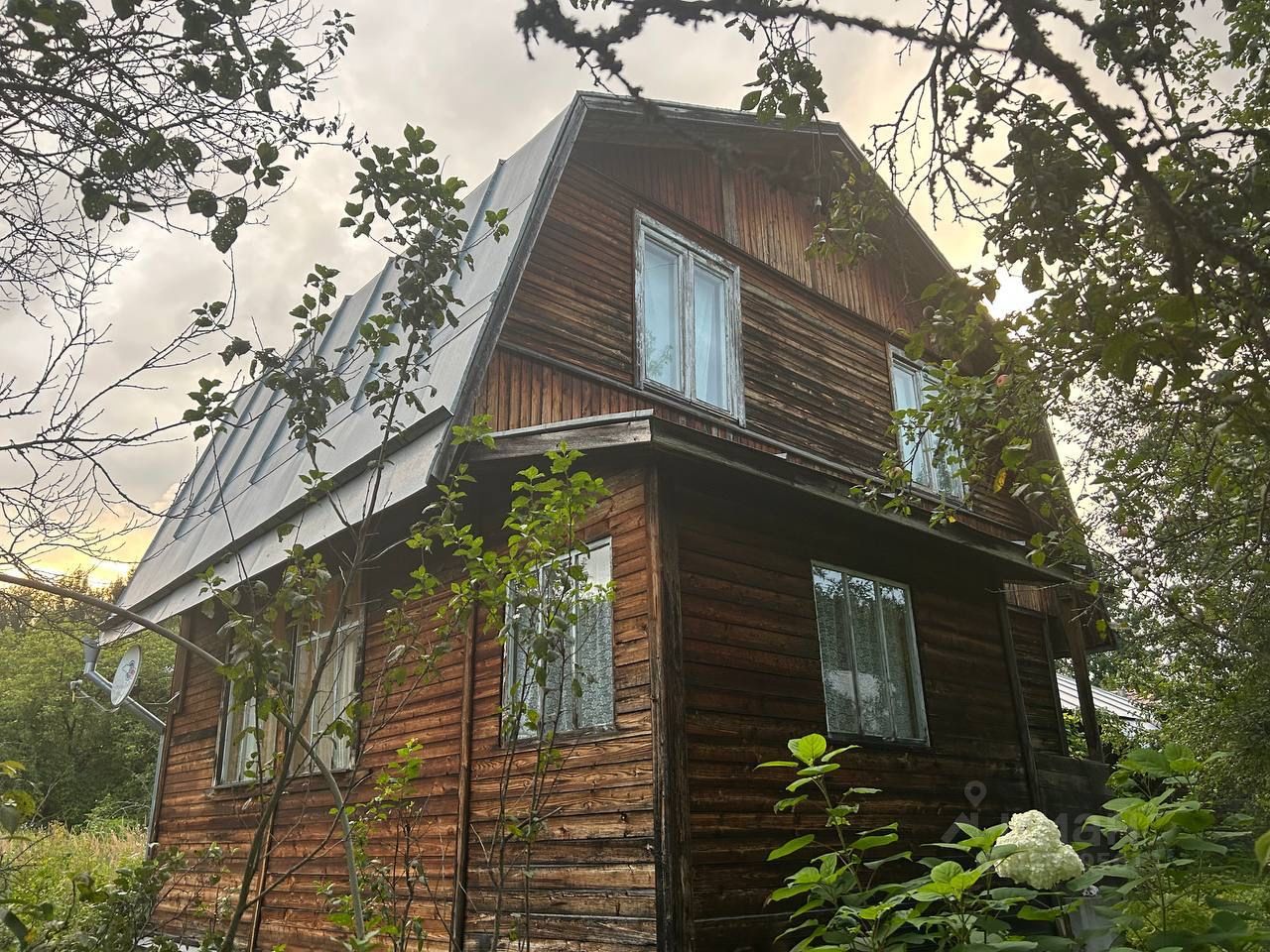 На участке посажены яблони и другие многолетние растения, стоят два деревянных дома. Проведены электричество и водопровод.