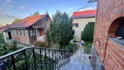 Ровный участок 13,5 сот. Разделен домом на две части, что делает его удобным для зонирования. На передней стороне участка располагается сад огромным количеством цветов и мангальной зоной, сбоку от дома участок для детей с игровыми сооружениями и батутами, а сзади участок используется под огород с огромной теплицей, грядками и насаждениями.