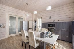 Этот стильный и современный дом площадью 400 м построен из клееного бруса, что обеспечивает экологичность и комфортный микроклимат. Светлая цветовая гамма интерьера создает ощущение простора и легкости.