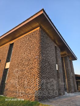 Фасад сочетает камень, дерево и стекло, что создаёт лаконичный, но выразительный облик.