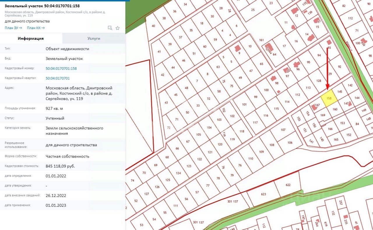 Продается земельный участок площадью 927 метров (9,27 соток), расположенный по адресу: Дмитровский район, Костинский с/о, в районе деревни Сергейково, участок 119, коттеджный поселок Сергейково, между Дмитровским и Ярославским шоссе, 56 км от МКАД.