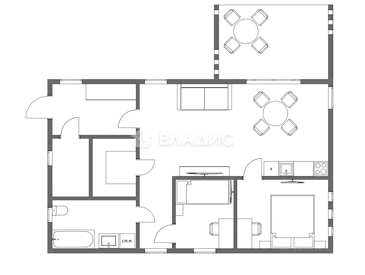 - Две спальни + большая кухня-гостинная с верандой предоставляют возможность гибкой планировки пространства под ваши нужды.