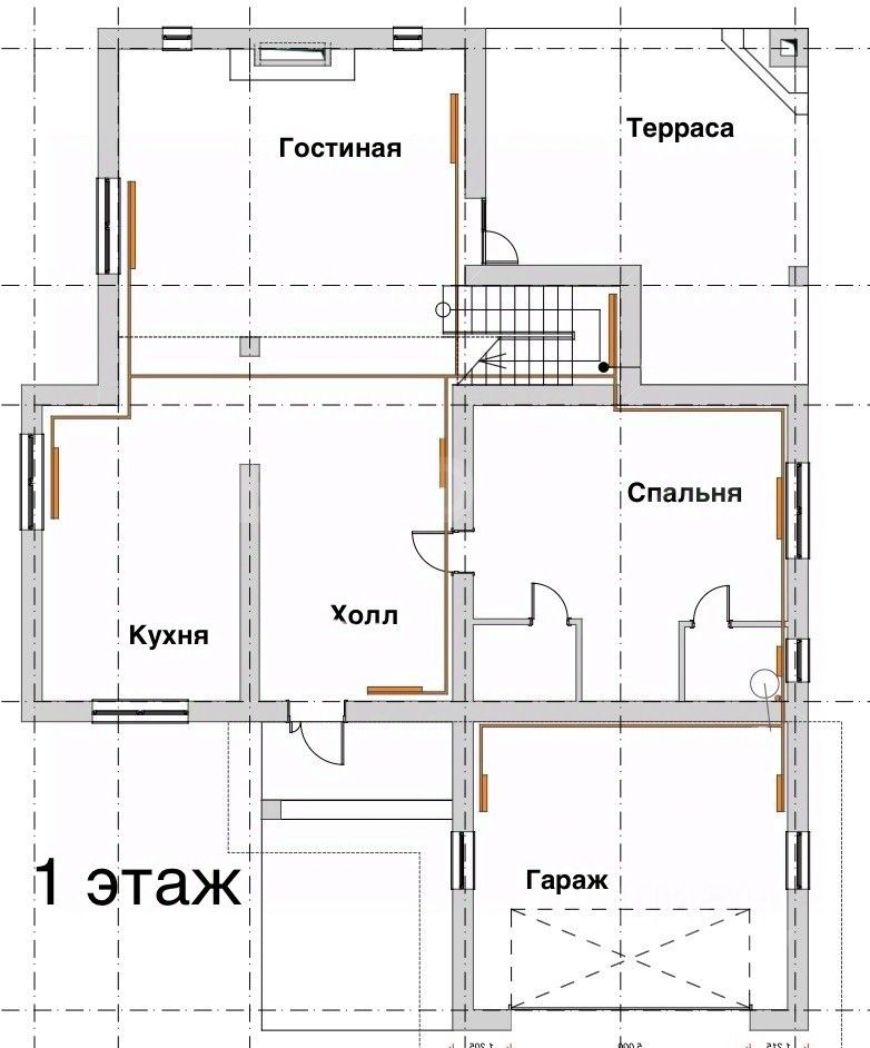 - 1 этаж: кухня-гостиная с камином и выходом на террасу с зоной барбекю, спальня, гараж на 2 авто.