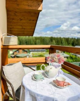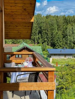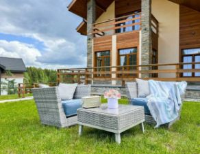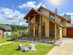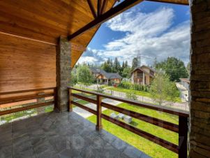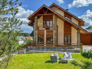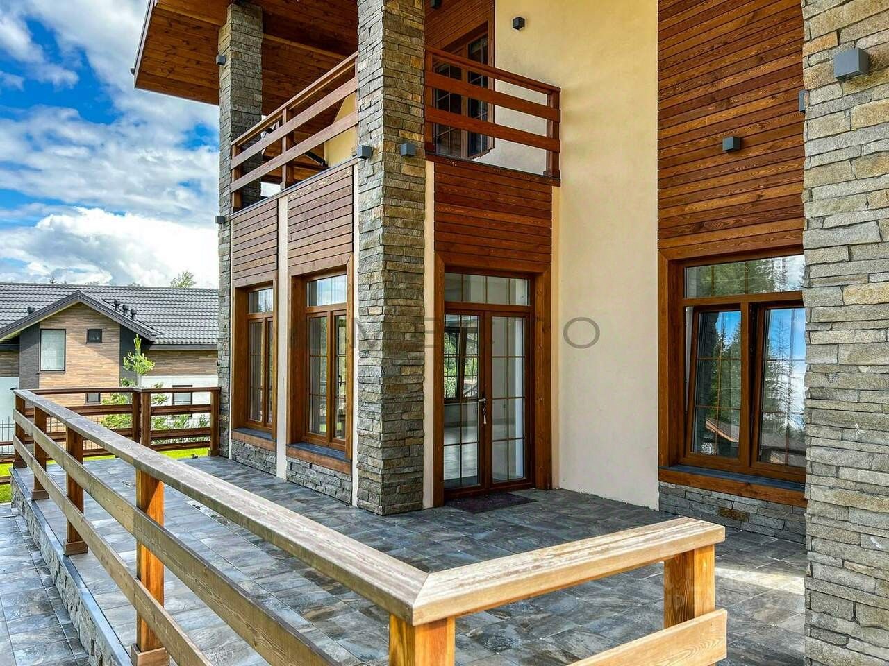 Дом построен в стиле альпийского шале, что в совокупности с красивым участком и лесом создает ощущение единения с природой. Каркас дома возведен из газоблоков марки Bonolit D500 на свайно-ростверковом фундаменте с буроналивными сваям глубиной 3 метра. Деревянные элементы фасада выполнены из термообработанной лиственницы, а кровля отделана гибкой двухслойной черепицей Docke. Все коммуникации в доме (электричество, вода, газ, канализация) центральные.