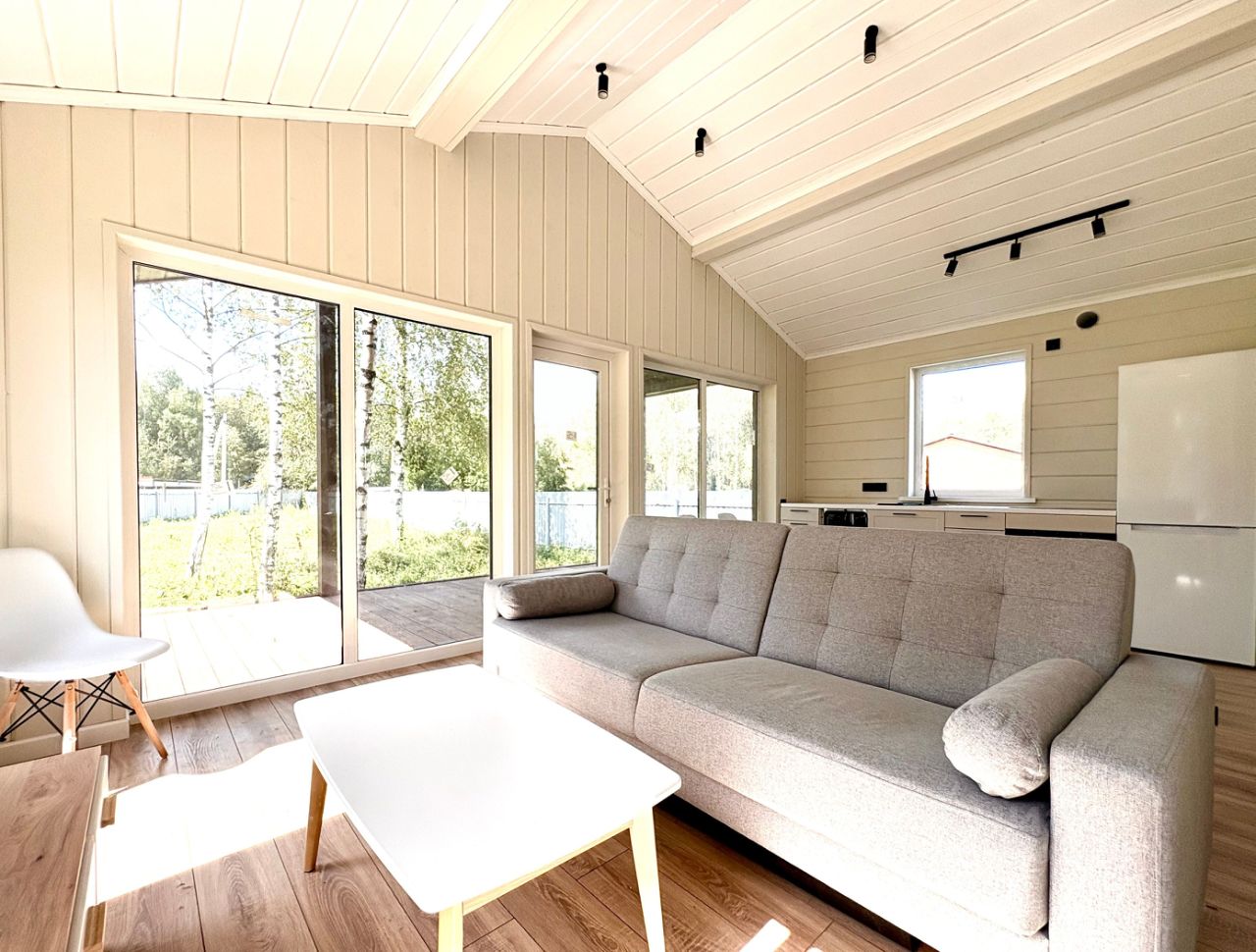 Вторая часть дома — это просторная кухня-гостиная также с мебелью — новый диван, журнальный столик, тумба под ТВ.