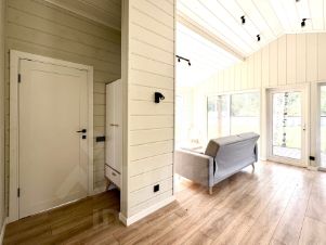 В доме выполнена отделка согласно современным тенденциям в светлых тонах из натуральных материалов.