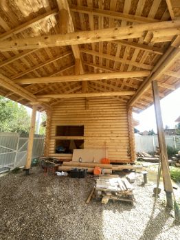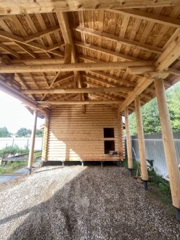 Навес для авто 60 кв.м. установлен на винтовые сваи покрытые термоусадкой, сруб антиспетирован средством Lignоfiх.