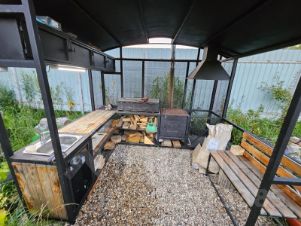 На бане, хозблоке, навесе и детской площадке подшита крыша подкладочным ковром (по технологии производителя Технониколь, возможно использование в качестве временной крыши).