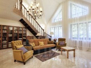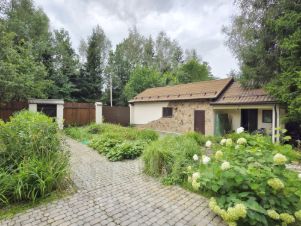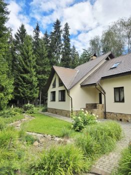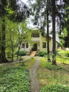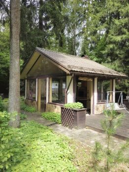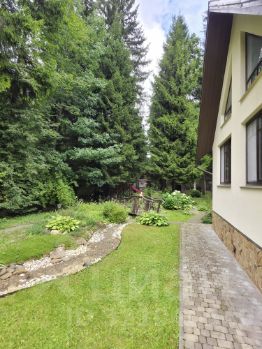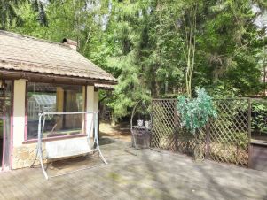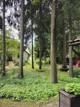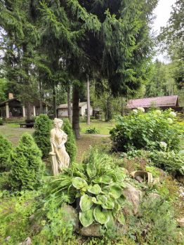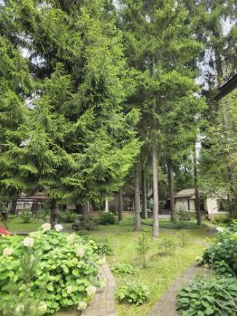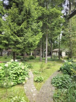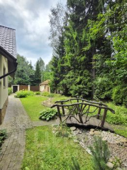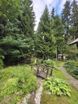 Участок правильной прямоугольной формы, огорожен высоким забором. На участке: вековые хвойные деревья, плодово-ягодные растения, цветы, теплица. Природный лесной ландшафт с декоративным ручьём и деревянным мостиком. Установлены: детский игровой комплекс, качели, садовые статуи.