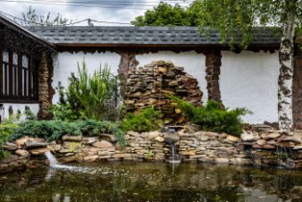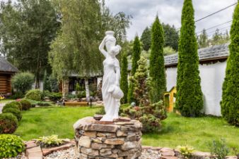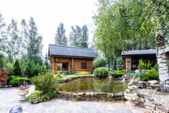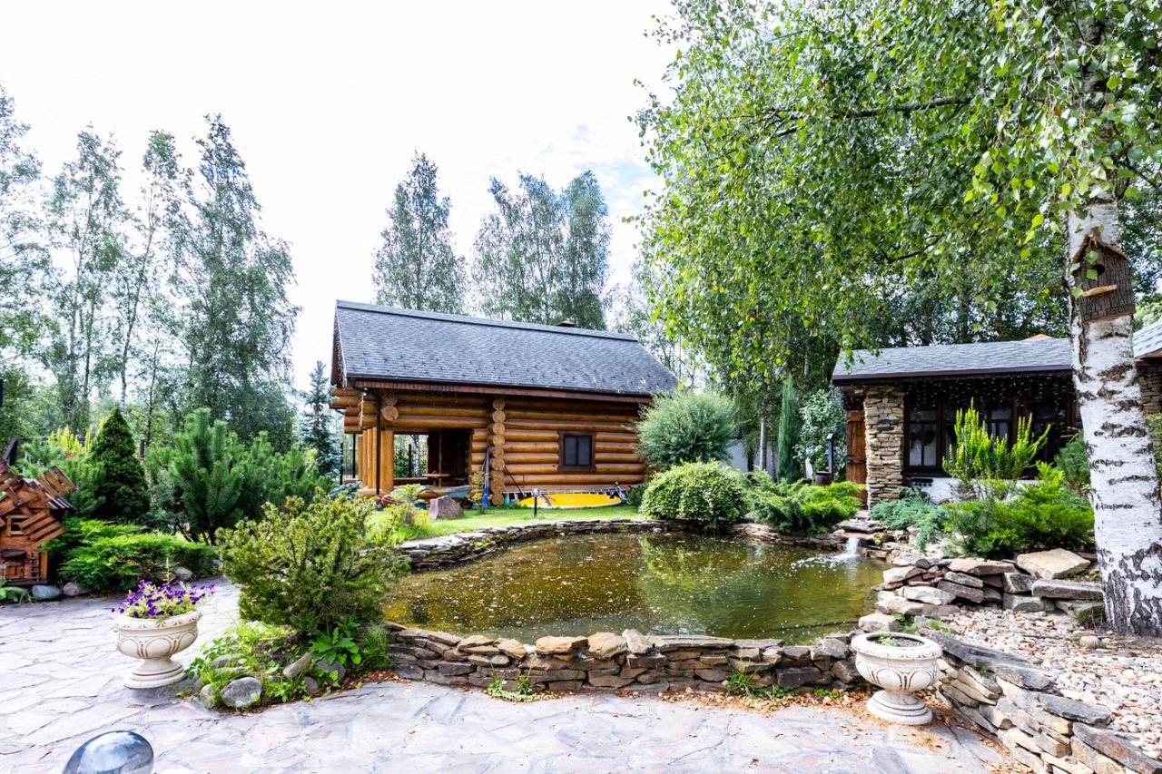 Ухоженная территория с дорогими хвойными насаждениями, благородным плитняком, продуманным освещением, дренажем и системой автополива. На участке обустроены декоративный водопад и фонтан.