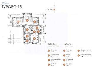 Первый этаж: прихожая, гардеробная, кухня, столовая, гостиная, спальня, с/у, бойлерная.