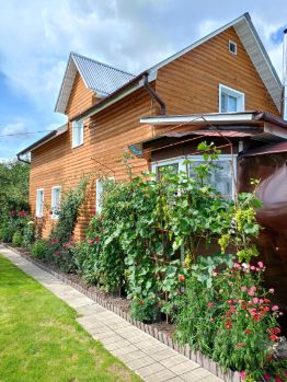 ПЛАНИРОВКА: Дом (два этажа). Площадь 110 м2. Построен из деревянных круглых бревен (сруб) и бруса. Обит блокхаусом.