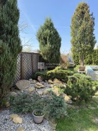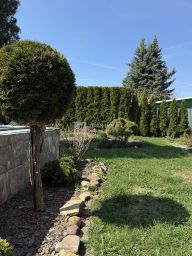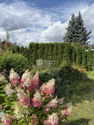 На участке: розарий, альпийская горка, забор из туи, хвойники, цветники.