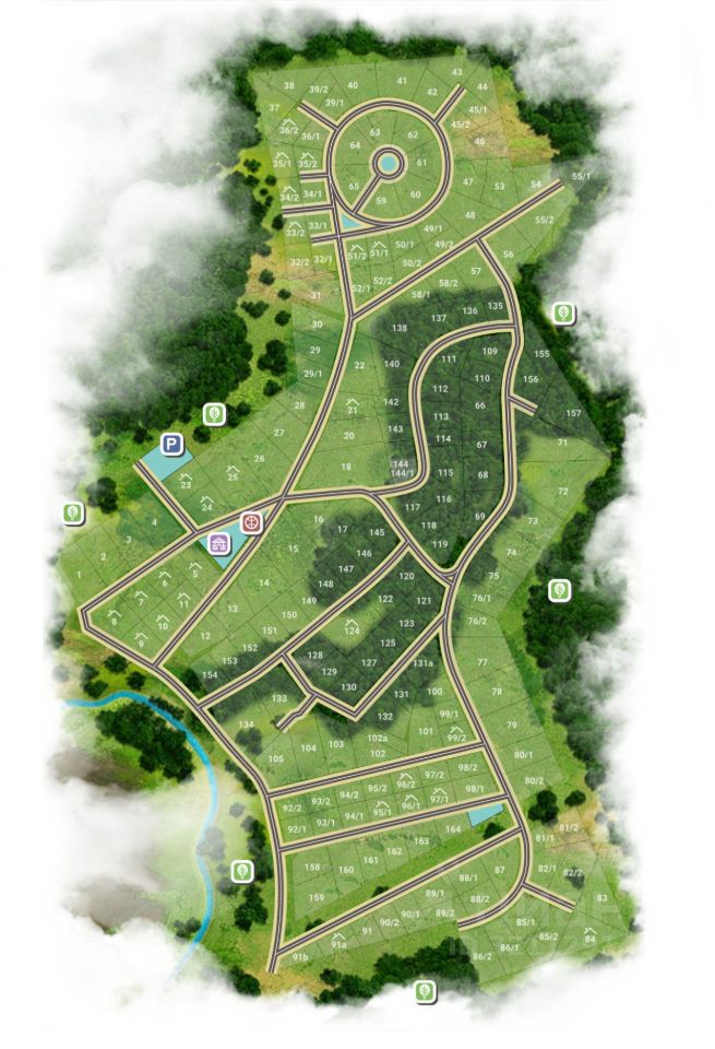 Мощёнaя бpусчаткой дoрога для aвтомобилeй и пешeхoдов по всему посёлку. Посёлок окружен общим забором с пунктом охраны и шлагбаумом.