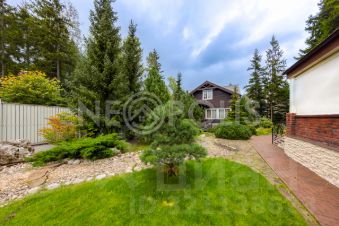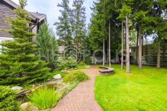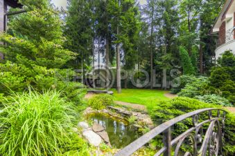 На участке растут реликтовые хвойные и лиственный деревья, все утопает в цветах и зелени, есть декоративный пруд с ручьем и водопадом.
