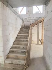 Дом построен на ленточном фундаменте с монолитно-армированным перекрытием, с использованием бетона марки М-400, (ленту, плиту и лестничный марш заливали за один день). Армированный пояс-марка бетона М500. Материал стен выполнен из газосиликатного блока "Bonolit" 400 мм. плотностью D400. Кровля метало-черепица.