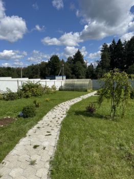 Участок: ровный, с газоном, плодовыми деревьями, кустами, грядками, навес для авто, теплица, сарай