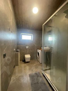 В большом санузле установлены душевая кабина, унитаз, стиральная машина. Стены санузла облицованы эффектной крупноформатной плиткой.