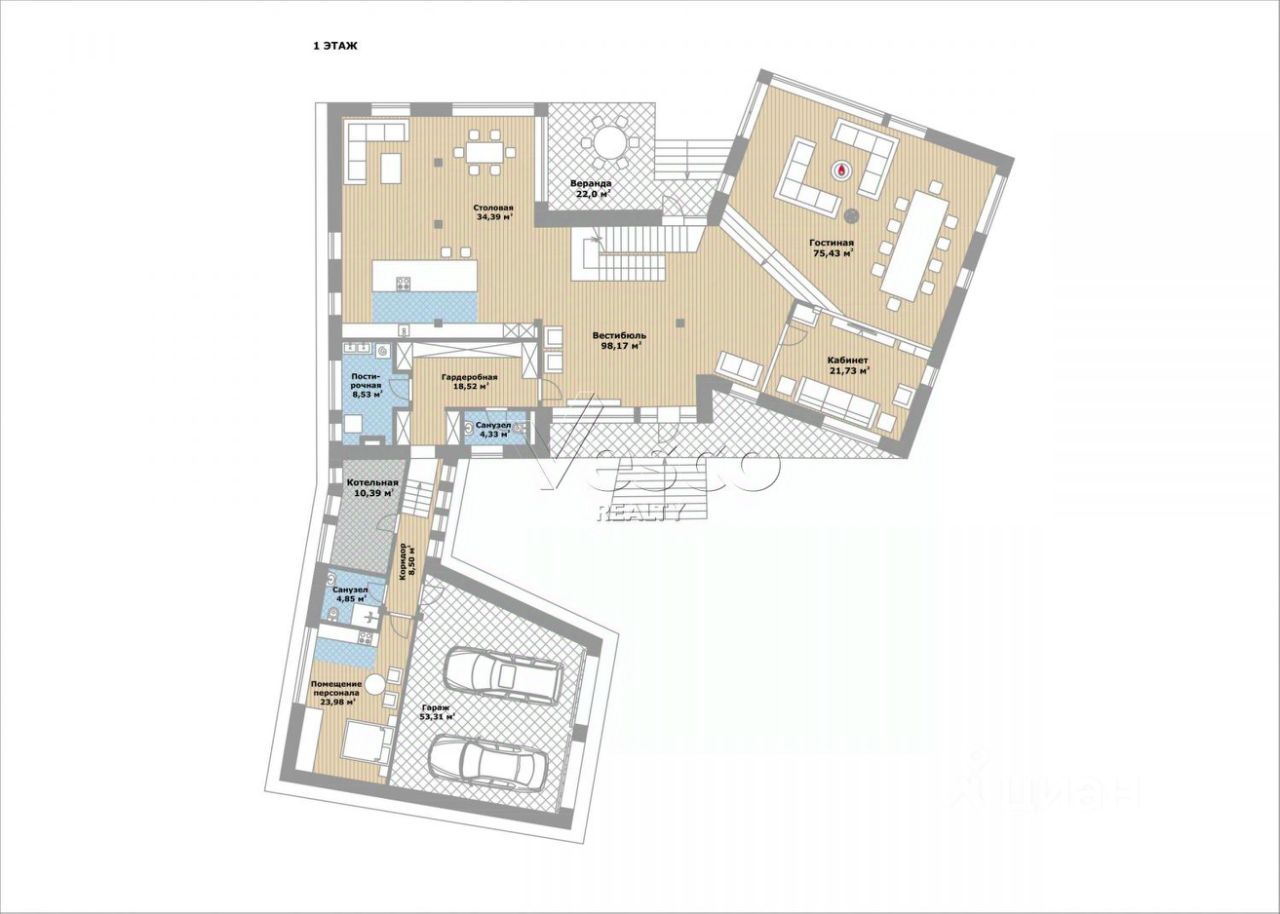 Общие помещения: вестибюль (98,2), гостиная (75,4), кухня-столовая (34,4), веранда (22), кабинет (21,7), гардеробная (18,5), гостевой с/у (4,3), гараж на 2 м/м (53,3).