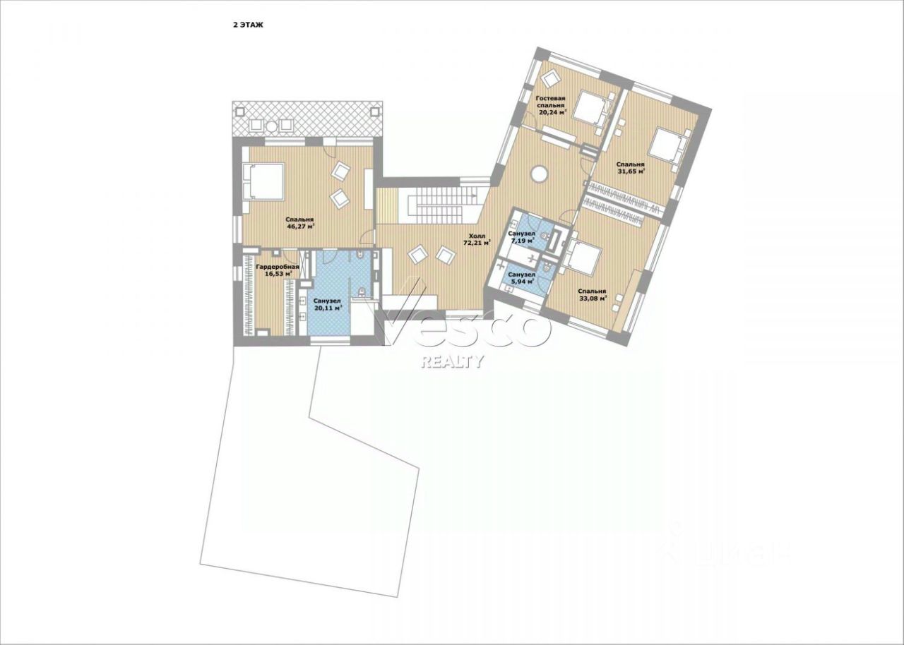 Спальня 1 (33,1) с ванной (6), спальня 2 (31,7) и спальня 3 (20,2) с общим с/у (7,2), холл (72,2).