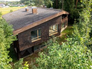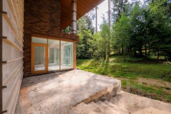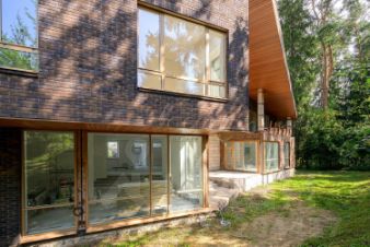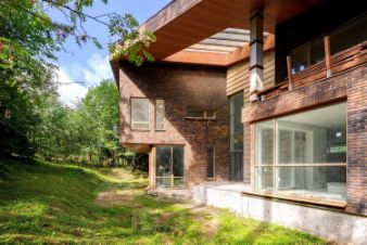 Фасад дома отделан клинкерным кирпичом, мрамором и лиственницей.