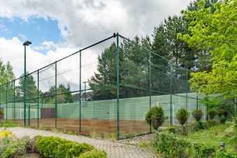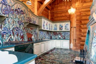 На территории расположен уютный летний дом с витражным остеклением, который наполняет пространство светом и гармонично связывает интерьер с окружающей природой. Внутри летнего дома находится стильная изразцовая печь.