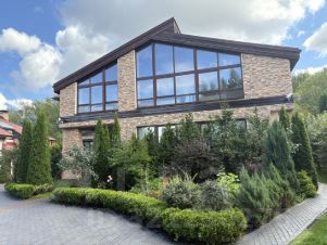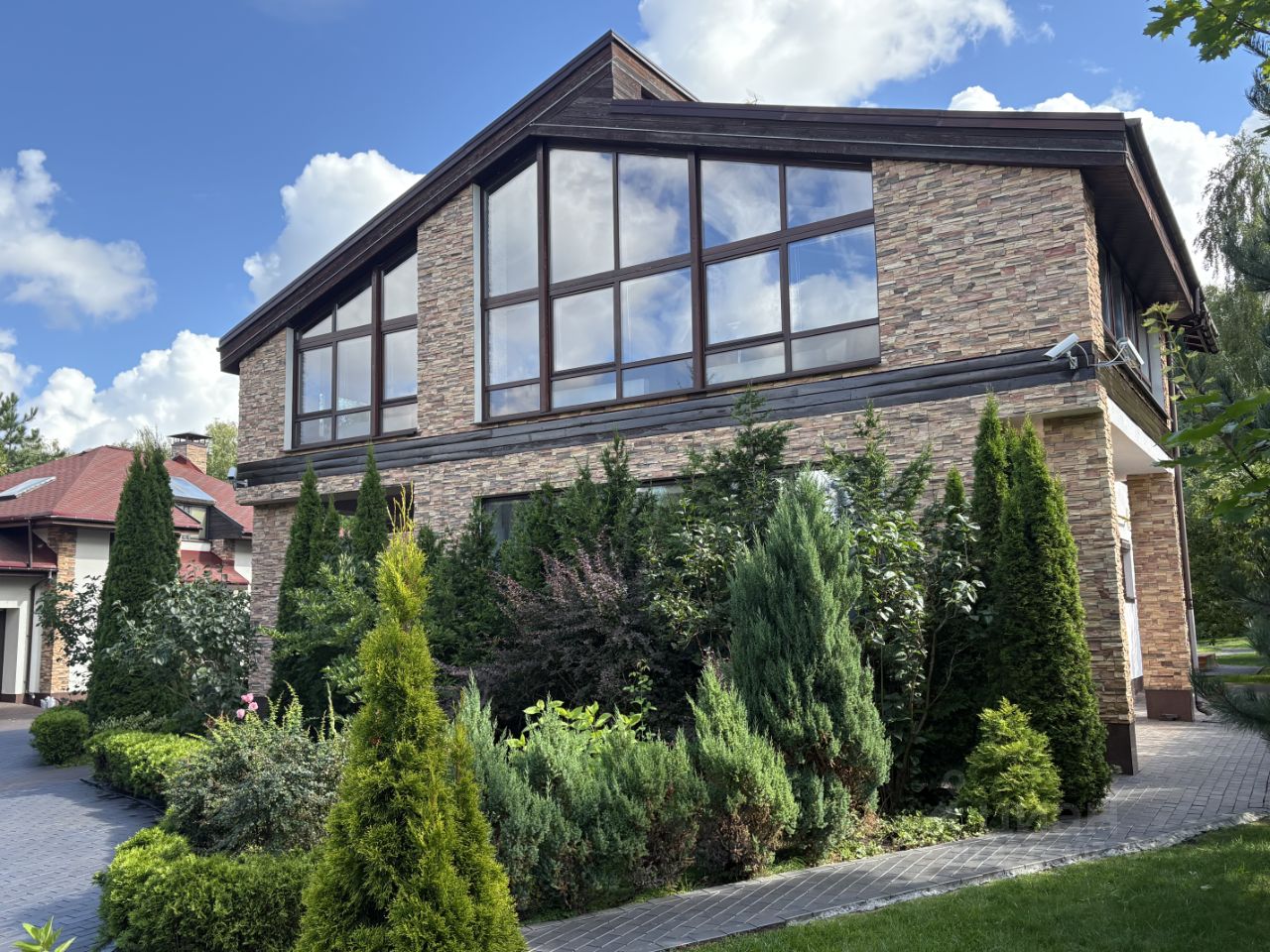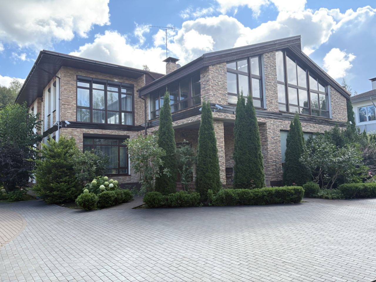 В коттеджном посёлке ПРОМЕНАД продаётся дом под ключ площадью 595 кв.м. на участке 34,68 соток, участок граничит с живописным смешанным лесом, дополнительно, в пользовании имеется 25 соток леса. Так же на участке расположено отдельно стоящее здание площадью 300 м2., в котором размещены гараж на 2 ам, помещение охраны с постом видеонаблюдения, квартира для обслуживающего персонала, сауна, бильярдная, гостевая комната, открытая зона BBQ. Здание и основной дом связаны общими коммуникациями, выполнены в одном архитектурном стиле и составляют единый комплекс площадью около 1000 м2.