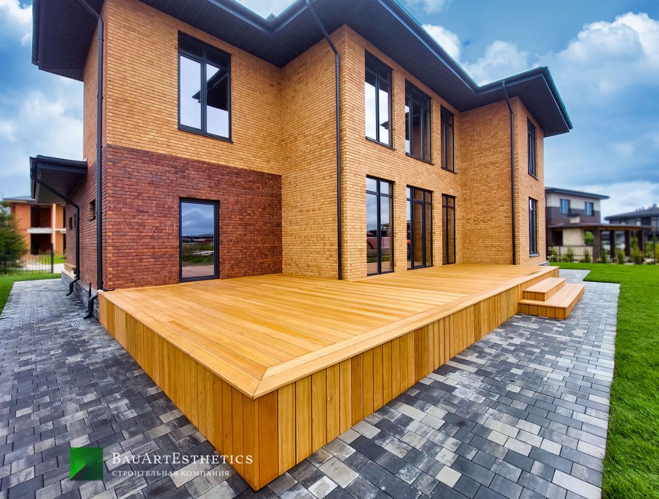 НОВЫЙ ДОМ С ВИДОМ НА ОЗЕРО Новый 2-этажный кирпичный дом 244,5 м2 в стиле Райт со вторым светом и большой площадью остекления расположен в КП бизнес-класса Павловы озера, 14 км от МКАД по Новорижскому шоссе. Фрэнк — это дом, в котором архитектура и природа говорят на одном языке. Возведенный из керамики Porotherm и облицованный кирпичом премиальной коллекции, особняк в стиле Райт создан для тех, кто понимает истинную ценность непроходящих трендов. Кирпичный фасад в оттенках солнечного янтаря и черного хрусталя, производит яркое впечатление благодаря своей необычайно естественной фактуре. Панорамные окна в пол, поднимающиеся на высоту более шести метров, стирают границы между интерьером и бескрайним небом. А из спален на втором этаже открывается вид на озеро. Второй свет наполняет гостиную солнцем и становится светлой доминантой, собирающей воедино пространство этого дома. Создавая этот проект, архитекторы заранее мысленно прожили каждый жизненный сценарий, возможный в этом стенах, предусмотрели любые потребности его будущих обитателей. Два полноценных этажа, 3 мастер-спальни с ванными и гардеробными комнатами, кабинет, гараж с прямым доступом в холл, хозяйственные помещения, делающие быт комфортным. Дом оснащен системой естественной вентиляции, создающей атмосферу, в которой легко дышать. Участок 9,44 сотки, ровный, правильной формы. Дом в комплектации "Теплый контур": • все стены, включая внутренние перегородки, выполнены из полнотелого кирпича; • мягкая кровля; • 5-ти камерные окна с двухсторонней ламинацией. Площадь остекления - более 70 м2. Дополнительно: • Рулонный газон премиального класса • Терраса из натуральной лиственницы сорт экстра Фрэнк - это дом, который воплотил в себе красоту природы и роскошь современного стиля.