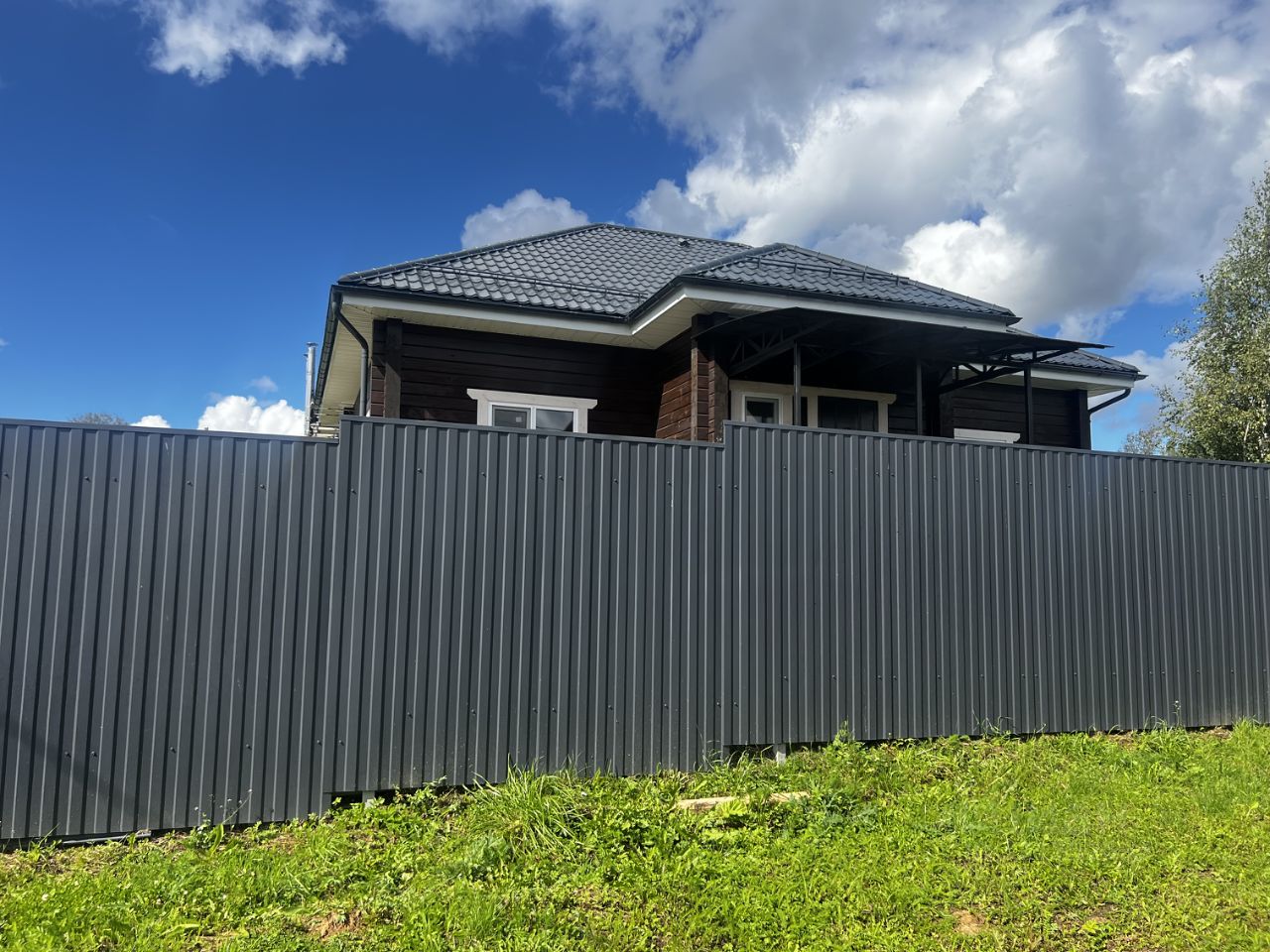 Участок огорожен профнастилом с откатными воротами, сделан дренаж по периметру всего участка (система водоотведения грунтовых вод).