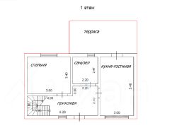 В доме 3 спальни, кухня-гостинная с выходом на участок прихожая, санузел. Над выходом из кухни-гостинной будет установлен навес для террасы.