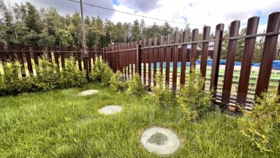Участок: 6,7 соток, по периметру установлен забор, выложена брусчатка под машиноместо и дорожка к дому, установлены откатные ворота и калитка, сделана ливневая система, посажен газон и деревья, подключено уличное освещение.