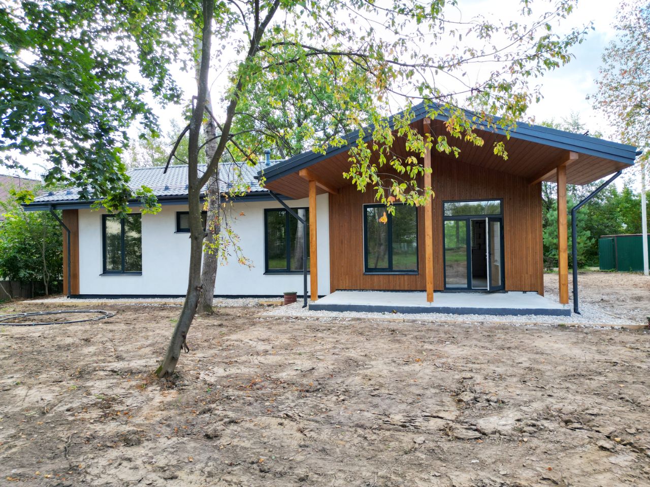 Внешняя отделка: штукатурка и заводской крашенный планкен.