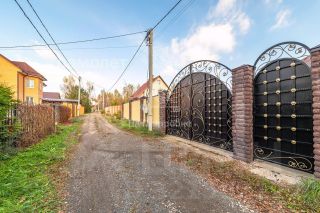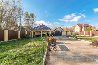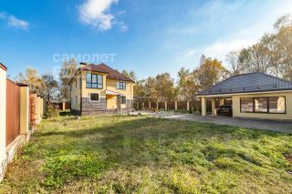 Дом расположен на участке в 10 соток правильной прямоугольной формы, огороженном капитальным забором из профнастила. Столбы забора сделаны из пеноблоков, стоящих на бетонном фундаменте. Подъезжая к участку, вы обязательно обратите внимание на огромные металлические ворота с кованым узором. Сразу за воротами с правой стороны стоит хозяйственная постройка с навесом для машины. От ворот к дому ведет асфальтированная дорога. На участке растут туи, плодовые деревья и цветы.