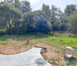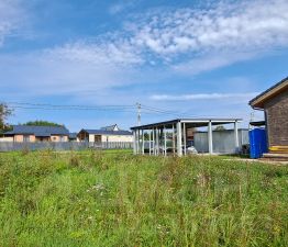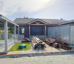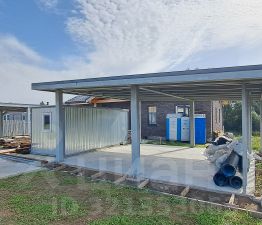 Участок спланирован, выполнена дренажная система. Залиты два парковочных места с надёжными навесами. Установлен газгольдер 2,7 м3, скважина, электричество 15 кВт, канализация-септик.