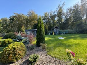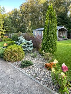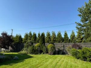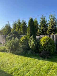 - Ландшафтный дизайн и хороший газон, туи вдоль забора по 3+ метра и огромные хвойные на участке