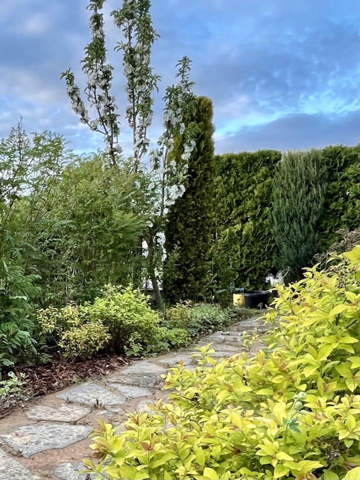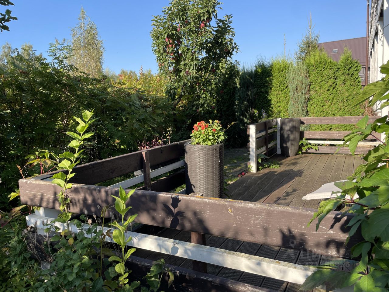 К дому пристроена терраса в окружении собственного сада с яблонями, малиной, земляникой, пряными и декоративными травами и деревьями.