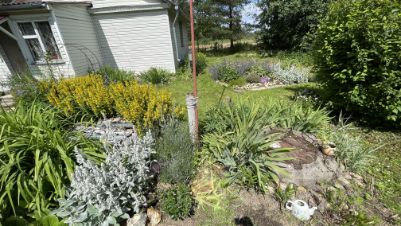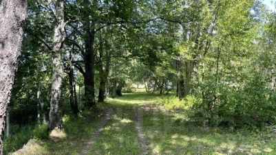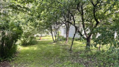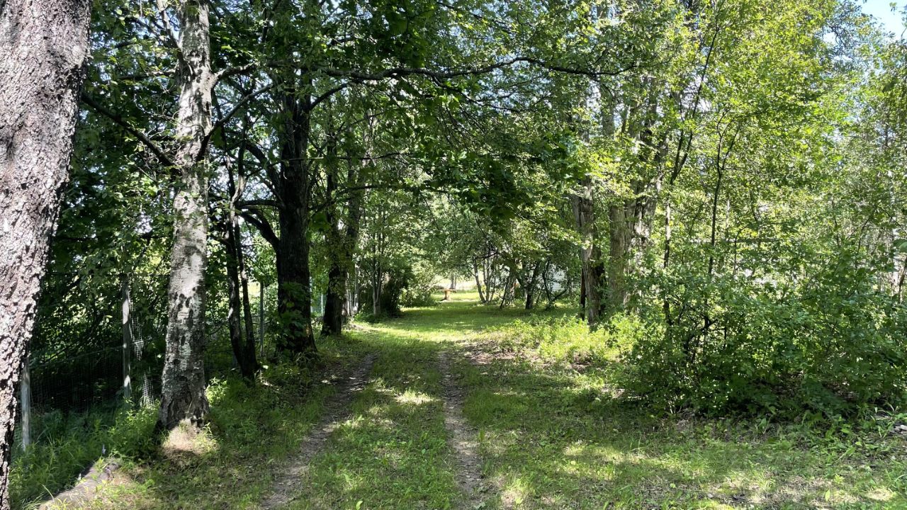 Просторный зеленый участок, отдельно стоящий на окраине деревни. Один сосед рядом.