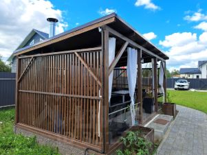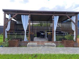 Барбекю: мангал, вытяжка, палубная доска, мебель в стиле ротанга, свет заведен.