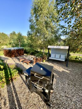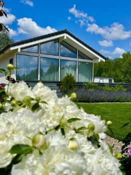Дом — технология фахверк, в которой деревянная клееная опорно-балочная система является частью стиля. Дом выполнен с высокими потолками (4,2 м в коньке), панорамным остеклением и эргономичной планировкой, сочетающей функциональность и эстетику. Панорамное остекление обеспечивает исключительный вид на участок и фоновое природное окружение из высоких елей, берёз и дубов.