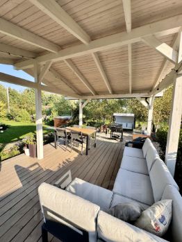 Просторная открытая терраса вдоль двух сторон дома с покрытием из лиственницы. В стенах, полу и крыше использован утеплитель PIR (пенополиизоцианурат), не поддерживающий горение, максимально теплый материал из всех доступных в продаже.