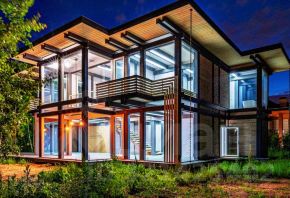 Дом построен по уникальной немецкой технологии фахверк, где каркас выполнен из прочных деревянных балок, а пространство между ними заполнено современными стеклянными стенами, что придает дому стильный и современный вид.